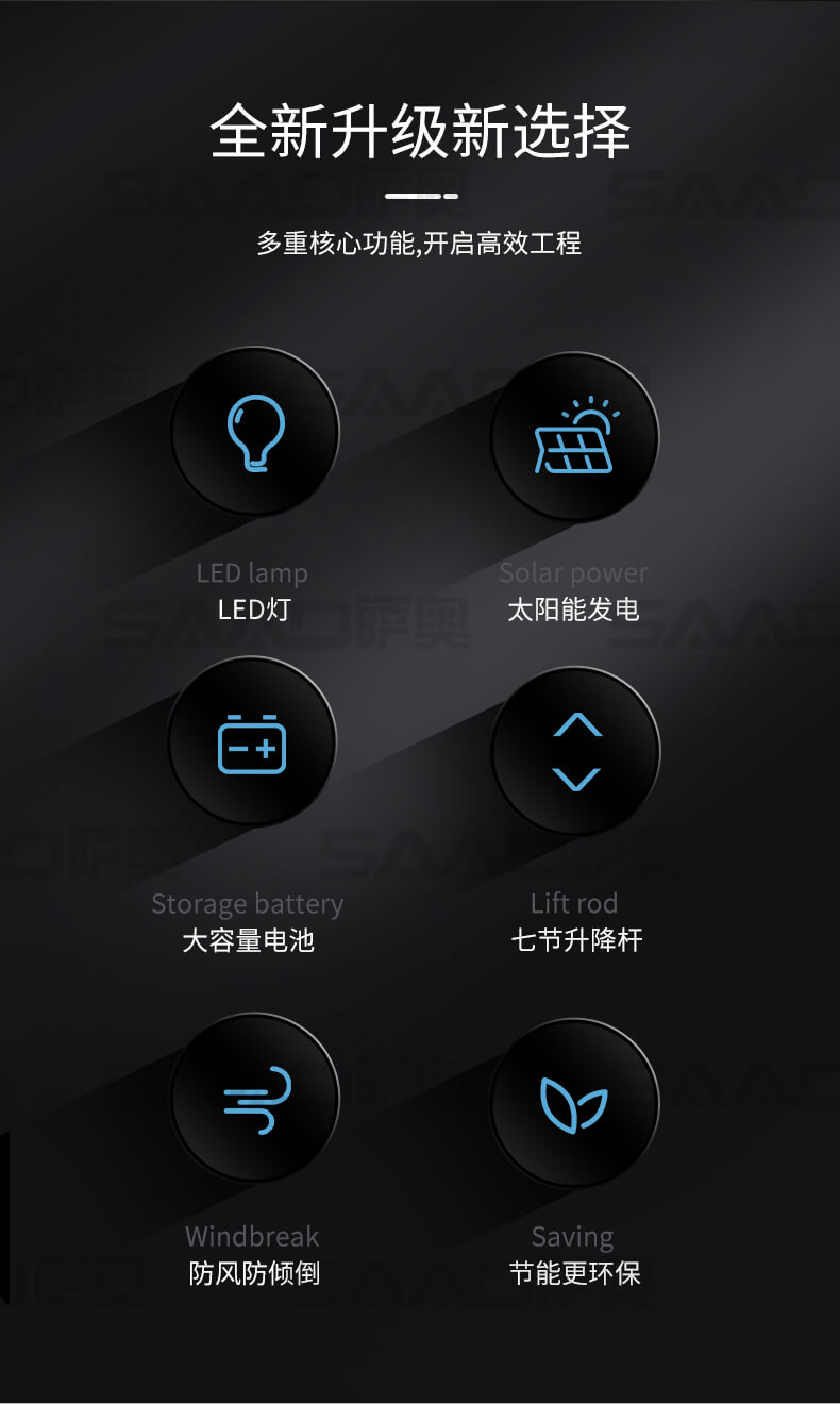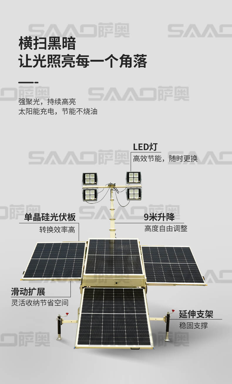 太陽能移動照明燈車適用于鐵路、電力、公安、消防、露天采礦等各種大型施工作業、事故搶修、搶險救災等工作現場對大面積高亮度照明的需要。
