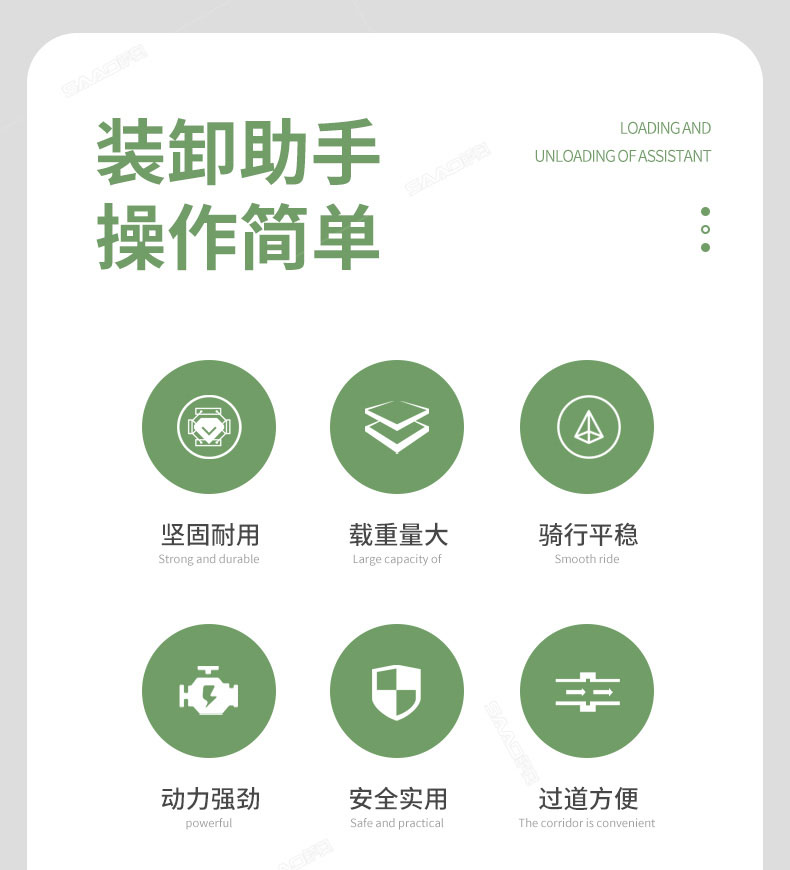 此款車適用于建筑工地、室內裝修、養殖場、工廠等場所,運輸沙子、水泥、土方、混凝土、建筑垃圾生活垃圾、養殖場動物糞便、飼料等,體積小操作簡單靈活,可原地360度轉圈,可進入樓層、樓道、電梯、吊籃等各種狹小空間作業,是您必不可少的裝卸助手。