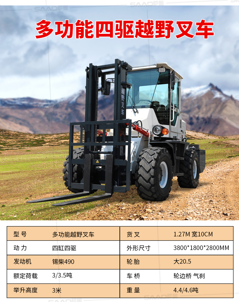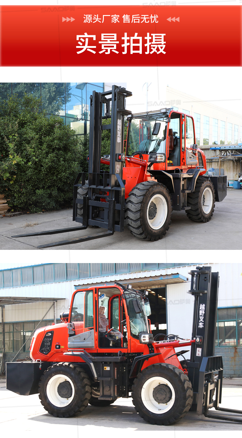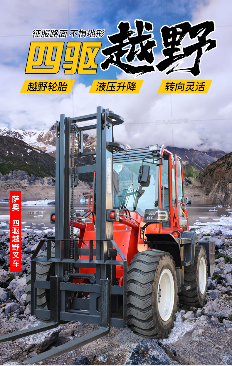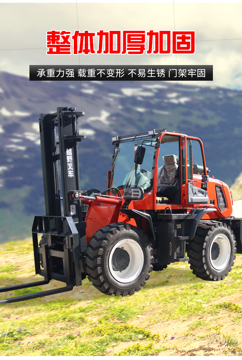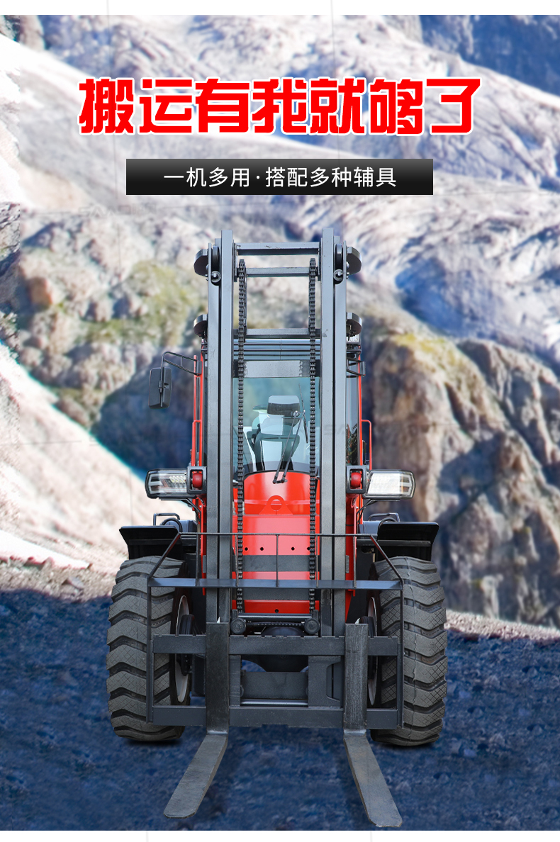 越野叉車可以在坡地和不平地面上進行貨物裝、卸、堆垛及搬運作業,具有良好的機動性、越野性可靠性。其功能多樣,可搭配側移器、調距叉、旋轉器、軟包夾、推出器、側翻叉、側