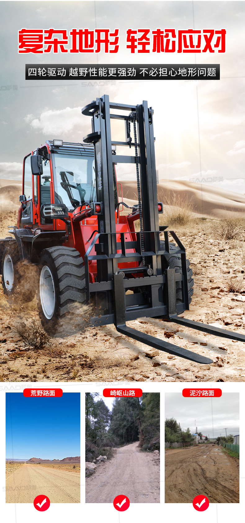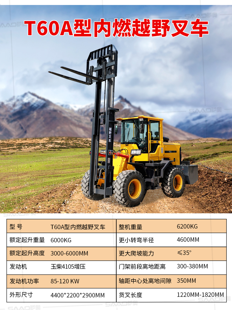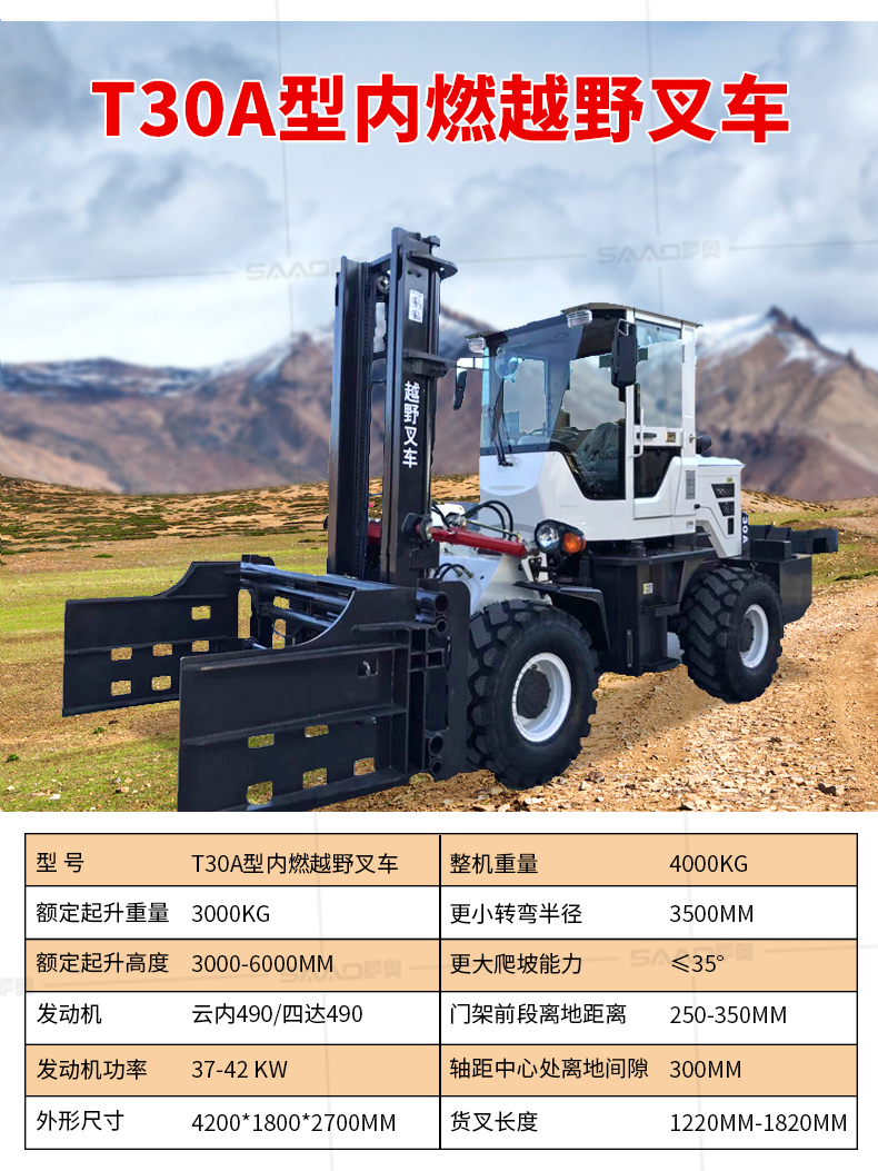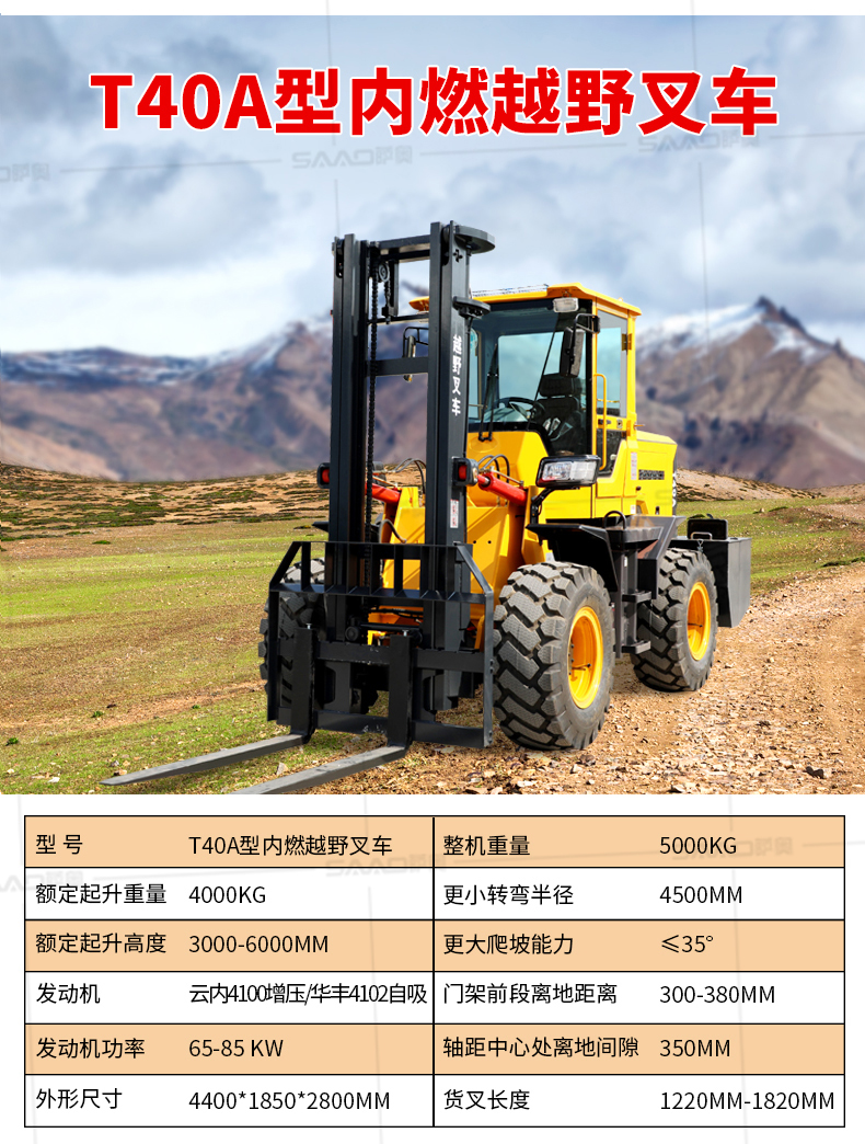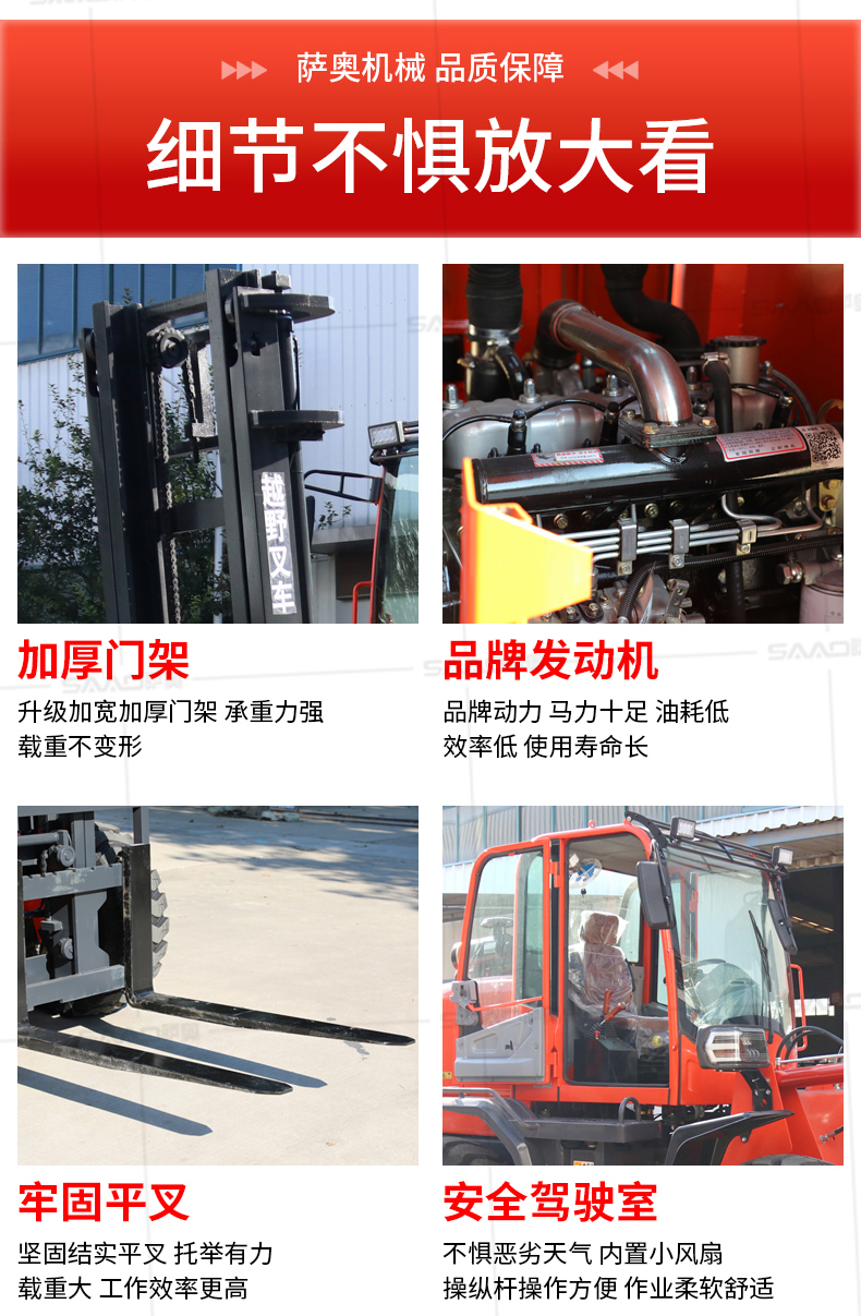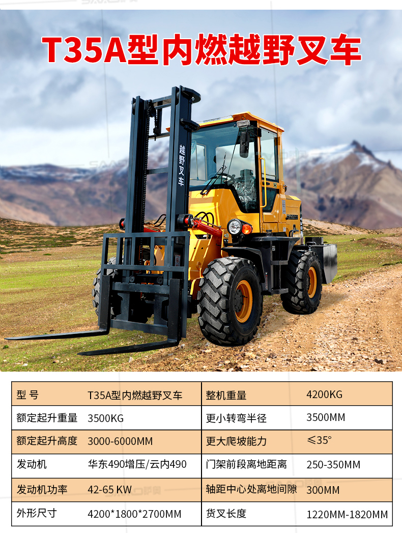 越野叉車可以在坡地和不平地面上進行貨物裝、卸、堆垛及搬運作業,具有良好的機動性、越野性可靠性。其功能多樣,可搭配側移器、調距叉、旋轉器、軟包夾、推出器、側翻叉、側