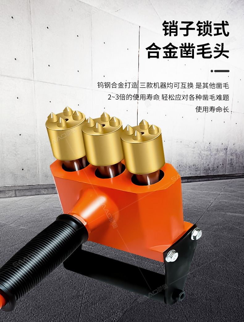 手持式鑿毛機主要用于混凝土剔鑿,水泥表面的打點、粗糙、清除浮漿;兩次鋪裝前清除舊的混凝土。 手持式鑿毛機是利用活塞打擊的方法在混凝土表面鑿毛,用來使新舊混凝土粘結