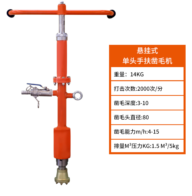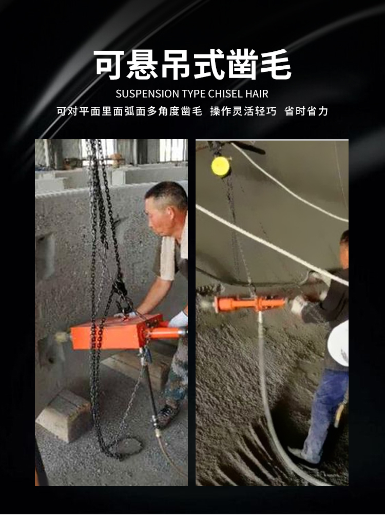 手持式懸掛鑿毛機機身有吊環,鑿墻面的話吊起來使用,對平面、立面、弧形等多角度進行鑿毛作業,打擊力大、鑿深自如,應用領域非常廣泛,又省力還方便。