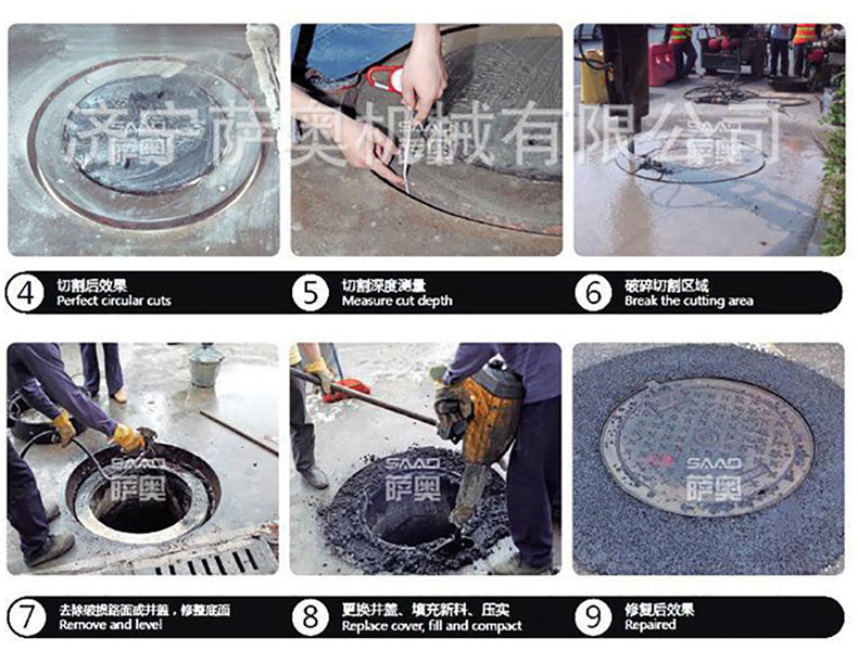 SQJ-1500型井蓋切割機,專門用于對城市道路中機動車道等井蓋周圍的水泥混凝土或瀝青路面進行圓形切割。為清楚井蓋周圍的破損路面提供分割區域,修復后的地面美觀,延長了路面的使用壽命。