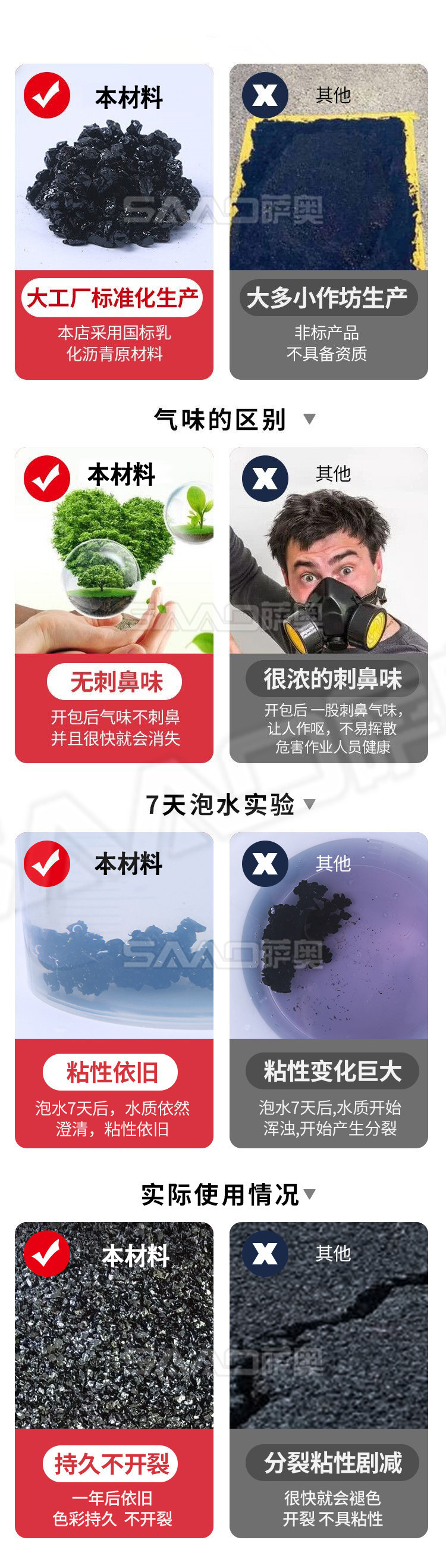 冷補料是采用特殊的方法改質(zhì)瀝青,使得瀝青具的粘結(jié)性,感壓性和粘彈性,在適當(dāng)壓實之后,能夠長久的粘在修補處不脫落。冷補料以其可以在全天候條件下修補路面,操作簡便,修補質(zhì)量好,存放長久,節(jié)省費用等諸多優(yōu)點,已被廣泛的應(yīng)用于各省市道路路面修補且日益受到道路養(yǎng)護(hù)部門的認(rèn)可和歡迎。冷補適用的環(huán)境溫度范圍寬,可以在-30至50之間適用,在雨雪天氣和積水坑穴都可以施工。