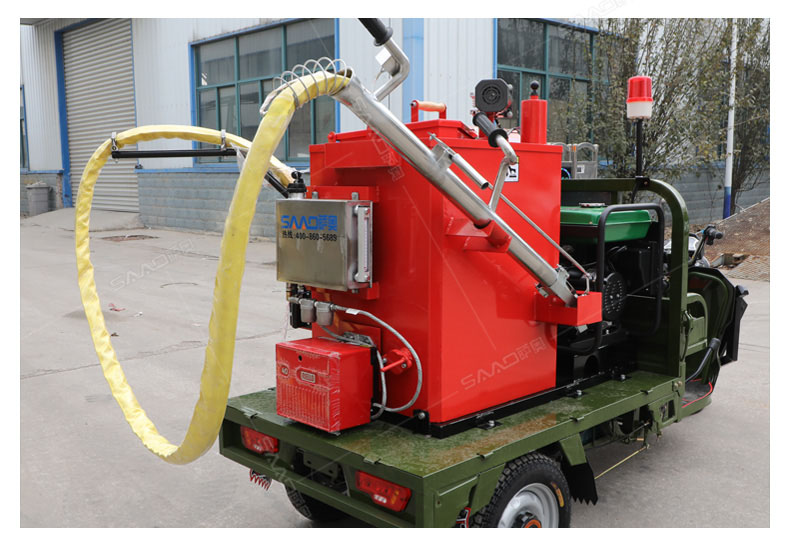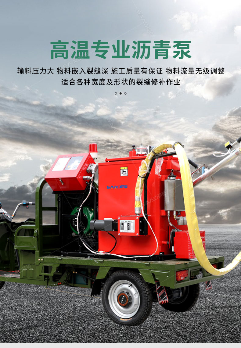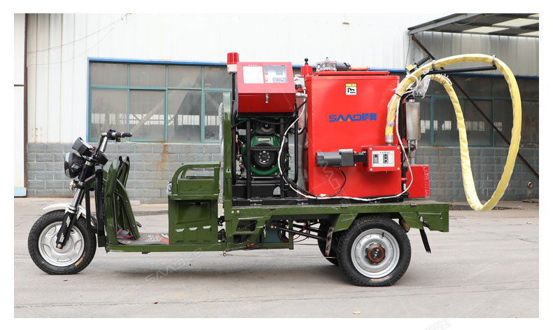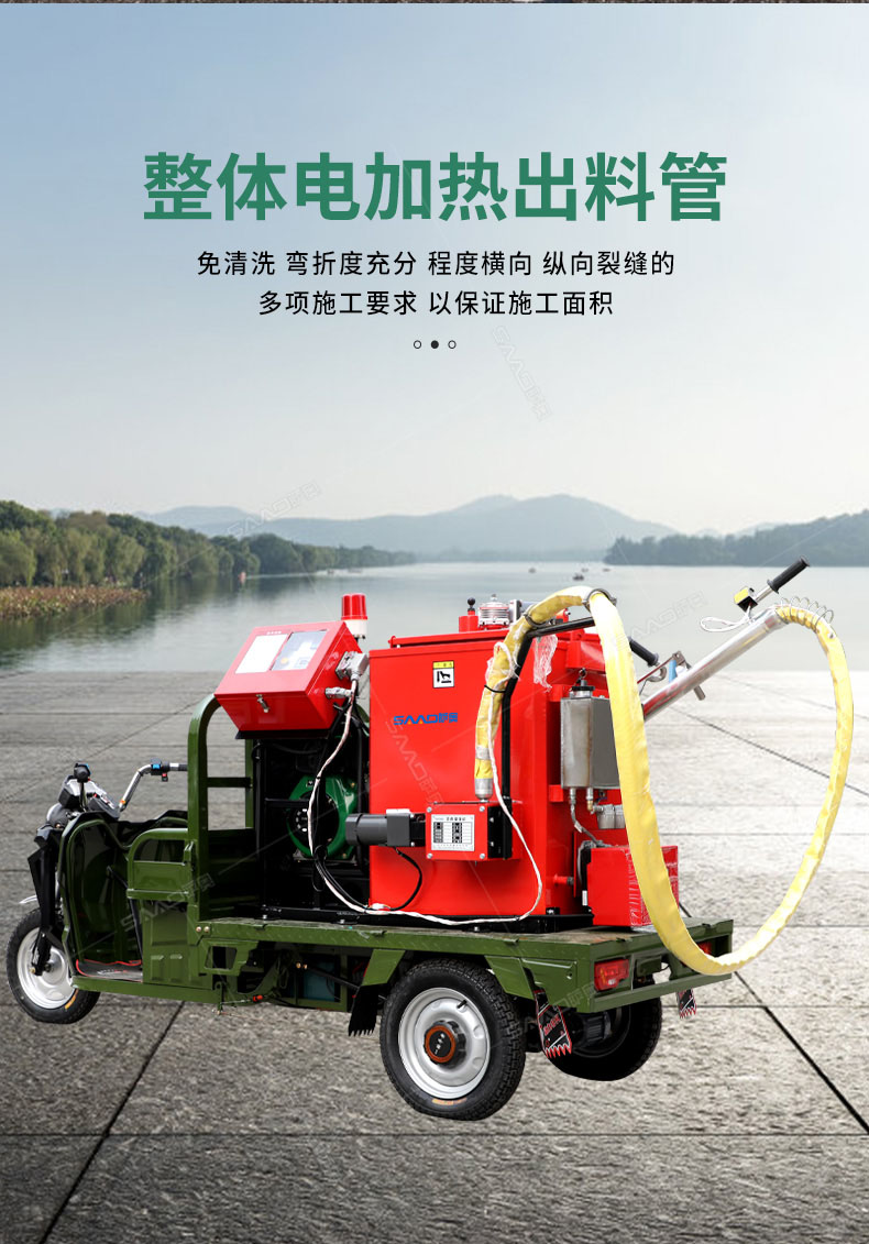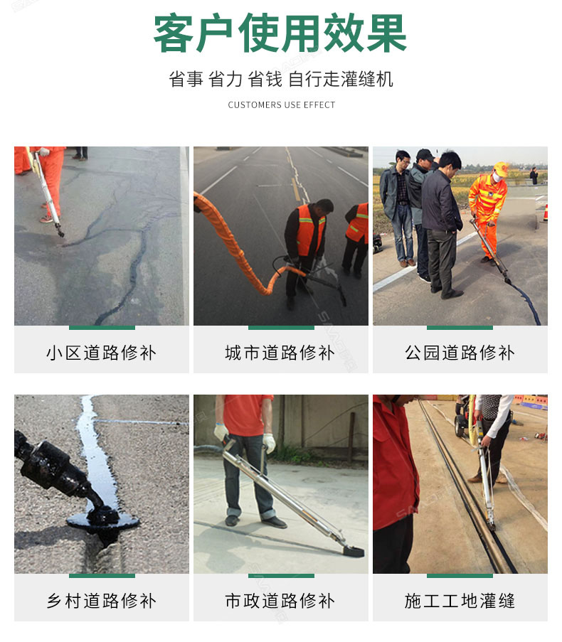 汽油灌縫機(jī)主要有手推式和自行式手持灌縫管操作,采用進(jìn)口柴油燃燒器加熱。在工作時首先在料箱內(nèi)加入瀝青或灌縫膠,啟動發(fā)電機(jī)供電,依次間斷打開導(dǎo)熱油泵開關(guān),燃燒器開關(guān),出料管加熱開關(guān);調(diào)整自動溫控系統(tǒng)與材料的溫度相同,通過柴油燃燒器自動加熱熔料箱內(nèi)導(dǎo)熱油開始升溫(拖式為強(qiáng)制循環(huán))使材料融化,溫度是通過自控系統(tǒng)來控制。溶料時間大約30-40分鐘左右。在材料融化、出料管溫度達(dá)到后可以進(jìn)行工作。手持灌縫管對正裂縫灌縫處理。瀝青泵的出料流量可調(diào)。在工作過程中隨時添加材料保證工作的連續(xù)性。
