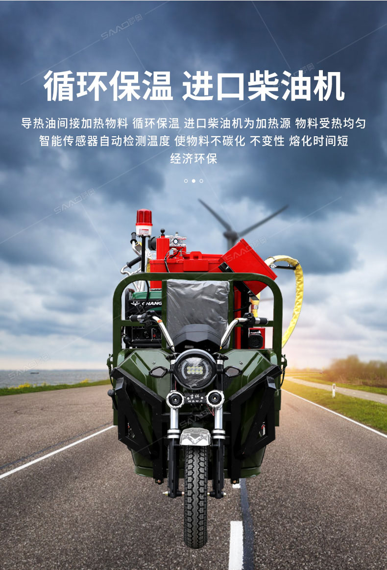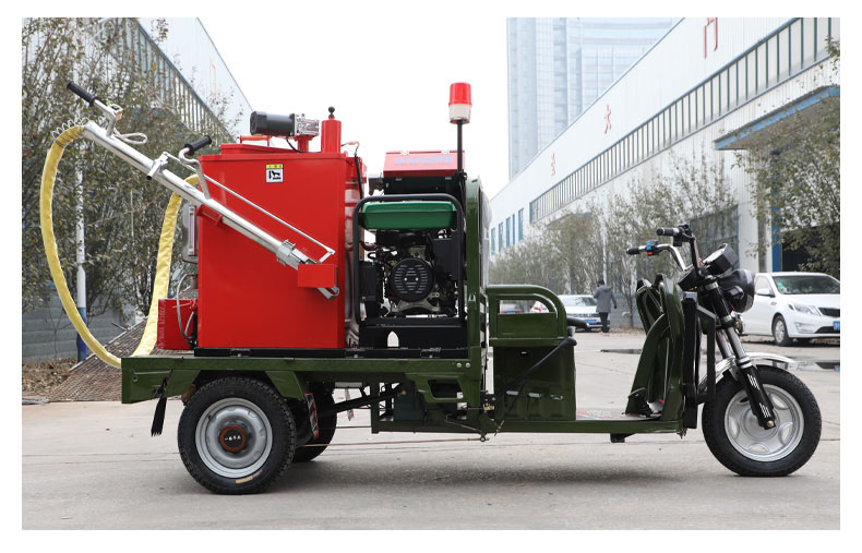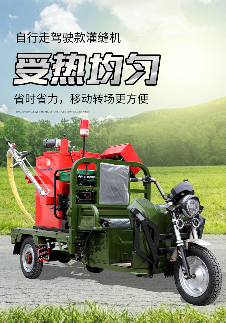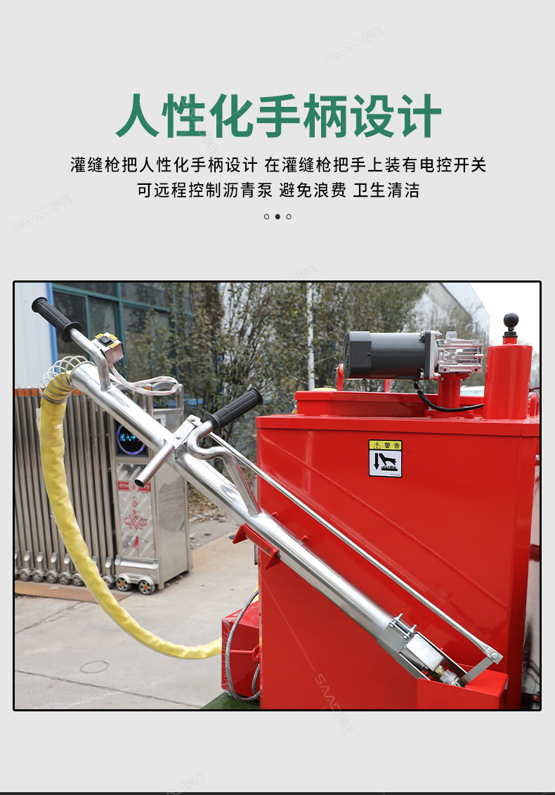 汽油灌縫機(jī)主要有手推式和自行式手持灌縫管操作,采用進(jìn)口柴油燃燒器加熱。在工作時首先在料箱內(nèi)加入瀝青或灌縫膠,啟動發(fā)電機(jī)供電,依次間斷打開導(dǎo)熱油泵開關(guān),燃燒器開關(guān),出料管加熱開關(guān);調(diào)整自動溫控系統(tǒng)與材料的溫度相同,通過柴油燃燒器自動加熱熔料箱內(nèi)導(dǎo)熱油開始升溫(拖式為強(qiáng)制循環(huán))使材料融化,溫度是通過自控系統(tǒng)來控制。溶料時間大約30-40分鐘左右。在材料融化、出料管溫度達(dá)到后可以進(jìn)行工作。手持灌縫管對正裂縫灌縫處理。瀝青泵的出料流量可調(diào)。在工作過程中隨時添加材料保證工作的連續(xù)性。
