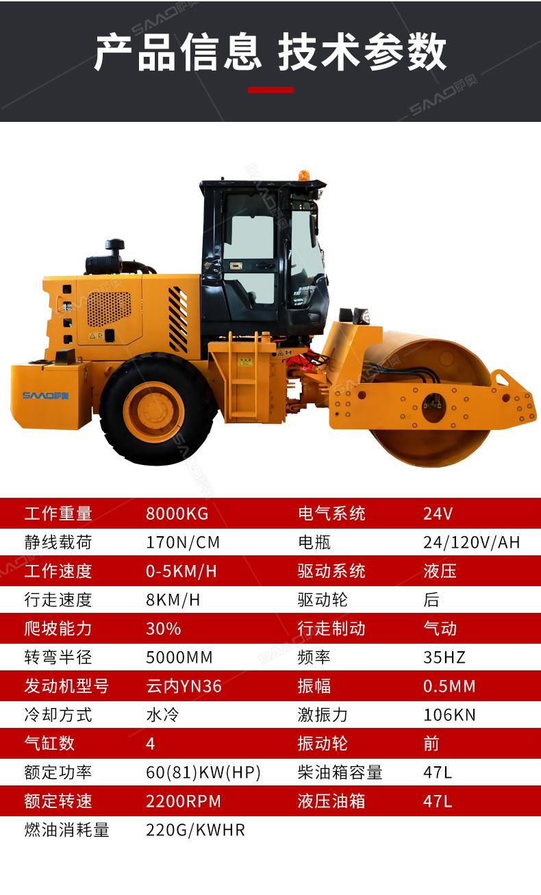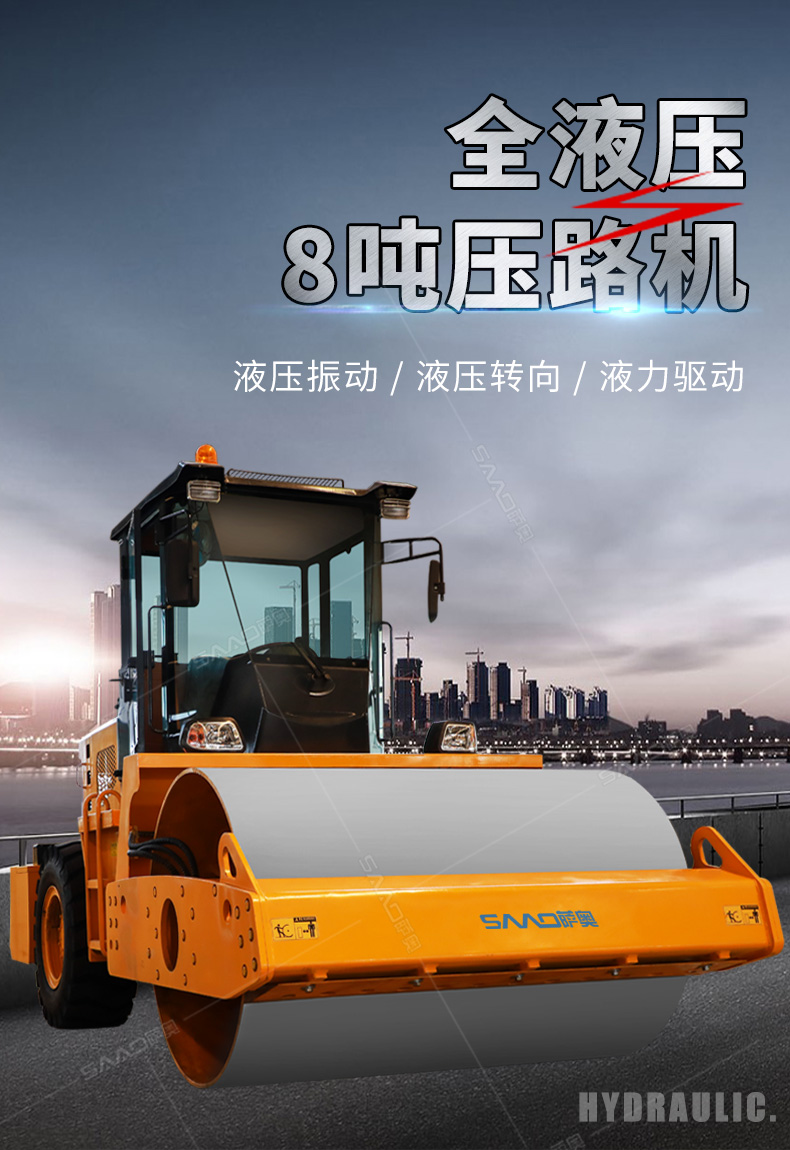 8噸壓路機主要應用市政道路、公路維護,具有強大的激震力及很高的靜線壓力,適宜于碾壓非粘性材料如礫石、礫土、碎石、砂石混合料和巖石填方以及粘土等。